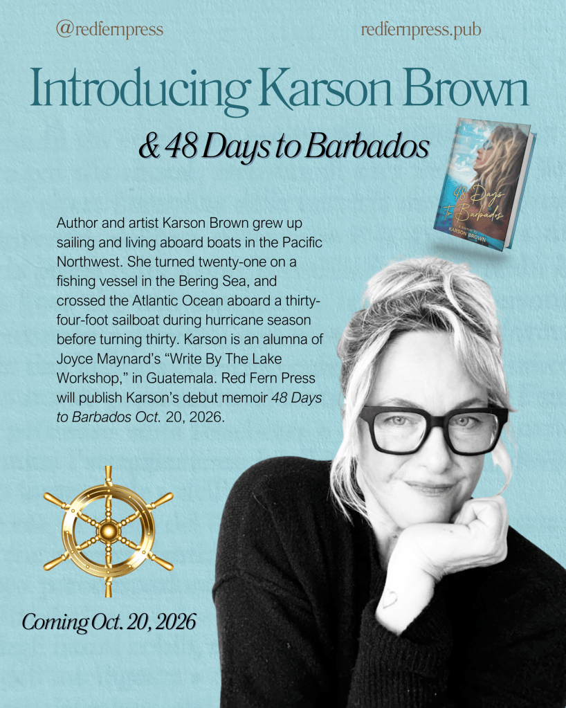 Karson is an alumna of Joyce Maynard’s “Write By The Lake Workshop”, in Guatemala. She has two short stories in the upcoming Vine Leaves Press 50 Give or Take Anthology, coming out November 2025. Red Fern Press will publish Karson’s debut memoir 48 Days to Barbados on Oct. 20, 2026.